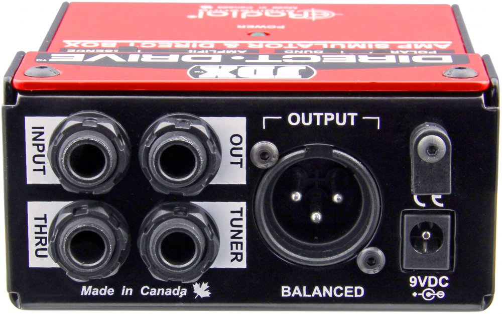 The design begins with a traditional ¼" guitar input and passive thru-put to feed a stage amp. This is then followed by a dedicated tuner output that is buffered in order to eliminate loading on the pickup or noise from the quartz clock. The guitar signal is then passed through a series of carefully sculpted filters to create Radial's signature JDX tone. This is modelled after the sound of a Shure SM57™ in front of a Marshall™ 4x12 cabinet. The Direct-Drive goes further with two more voicing settings: the first adds a vintage Marshall™ tube head character to the signal path while the second delivers a tone reminiscent of an early Fender Twin™. The two amp tones can be further tailored using a presence switch for extra sparkle. The guitar signal exits the Direct-Drive via either a ¼" guitar-level output or via a balanced XLR to feed the PA. The direct box output is outfitted with a 180 polarity reverse switch to help phase-align monitors with the stage amp along with a ground lift switch to help eliminate hum and buzz caused by ground loops. The Direct-Drive may be powered using a standard 9V power supply or typical pedalboard power brick.