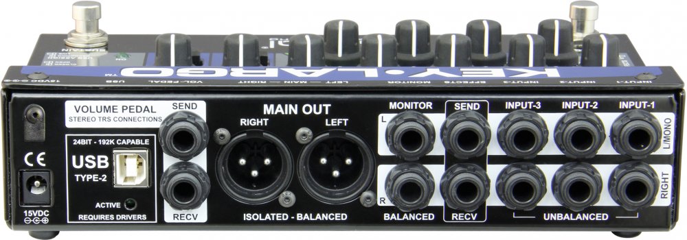 Designed for stage use, the compact design features three dual ΒΌ" analog inputs for standard performance keyboards along with a USB interface to connect a laptop for use with soft-synths. Each stereo input is equipped with an individual level control for quick onstage adjustments along with an effects loop to interface an external multi-effects device. The effects loop can then be turned on or off using the built-in footswitch to activate an echo or reverb when desired. The effects bus is stereo but may be summed mono when using guitar-style pedals. To add even more fun to the performance, a built-in sustain footswitch lets you connect the Key-Largo to your master keyboard or digital piano using a standard guitar cable, eliminating the need to bring a separate sustain footswitch to the gig!