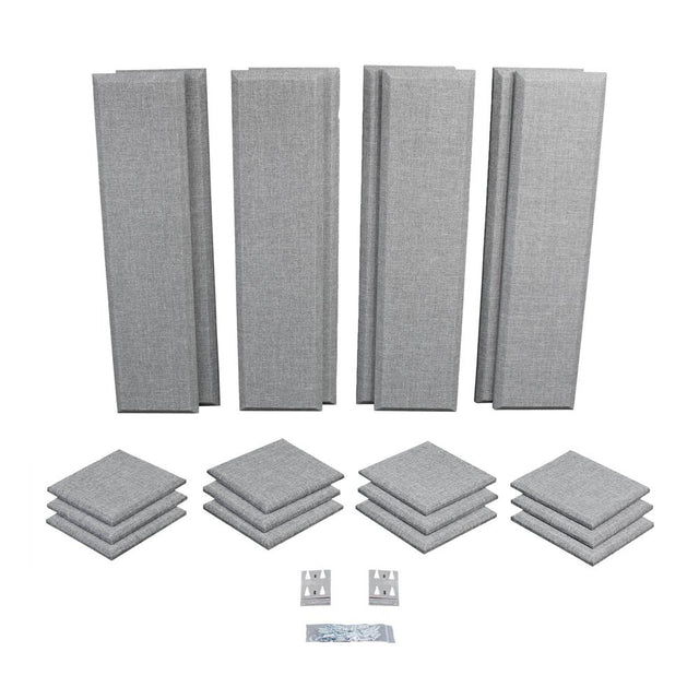 Complete acoustic treatment kit for medium-sized rooms. Includes panels for noise absorption and sound clarity, featuring a modern design in grey.