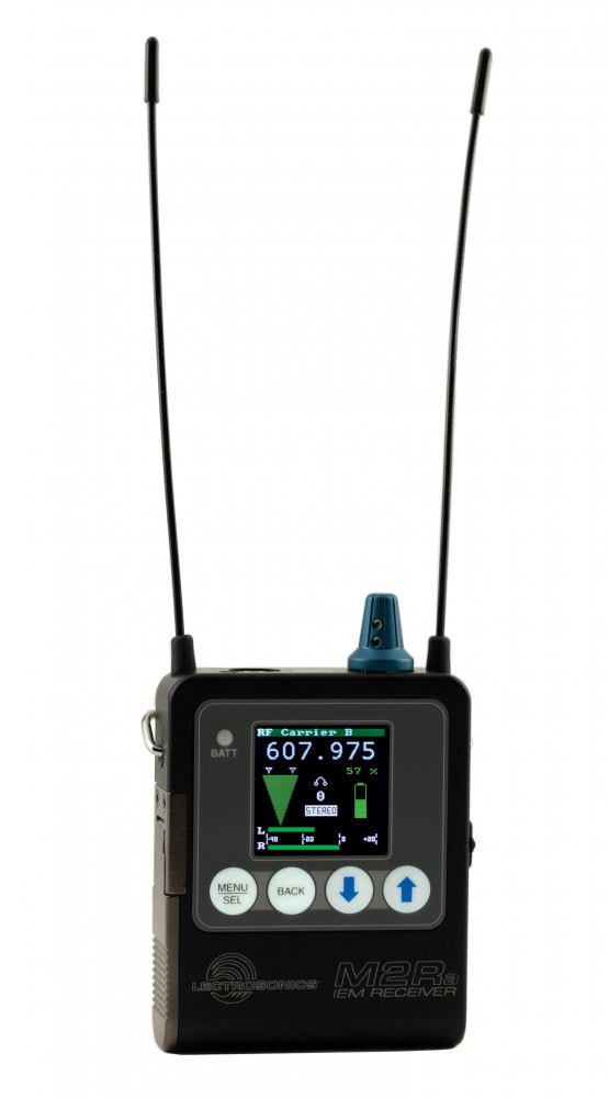 The M2Ra Digital IEM Receiver is an improved compact, rugged body-worn stereo digital receiver providing high quality sound for performers or any professionals needing to monitor detailed audio wirelessly. The M2Ra employs advanced antenna diversity switching during digital packet headers for seamless audio. The receiver uses digital modulation and covers 144 or 155 MHz (depending on version) of spectrum in the UHF band.