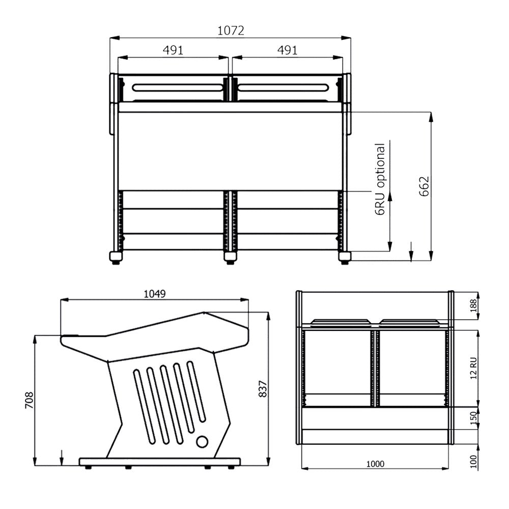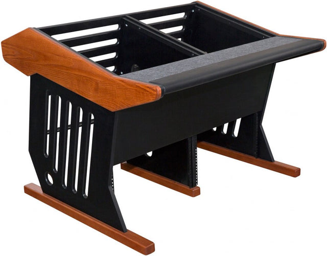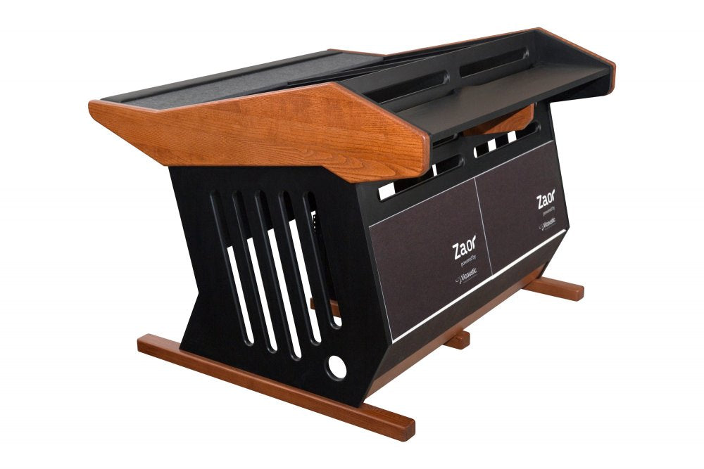 The Maestro user is putting final touches to the sound of mixes, masters, edits so listening is at the heart: an extra low profile allows for the desk to be the least in the way of the sound reproduction, the back has VMT absorption panels by Vicoustic to minimise chaotic reflections and resonances and the work surface is made from AERstop, an acoustic material that minimises reflections and doubles as mouse pad. A small armrest warrants smooth typing and low wrist stress. The complete desk is more air than structure, so that sound is not boxed in, air can flow freely and keep working temperatures at optimal levels. A dual cable path (audio/power) separates signals from power leads and thus minimises hum and other inductive noise. Chrome bars with pre-fitted Velcro strips allow for fast and clean (re-) cabling. 36 rack units - all the essential tools within easy reach and on the minimal footprint allow for a perfect workflow. Extra 18 RU can be installed below the desk, where visual contact is less important. The bottom can also be open to allow to stretch legs once in a while. Behind the rack units, a flat plane, lowered as to not impede sound travel, can carry screen(s) just at eye level, near fields for cross check sitting on optional isolators to avoid sound transmission through the desk, which would lead to smear in the lower frequencies. Nothing superfluous, nothing amiss! Ergonomics and acoustics integrated