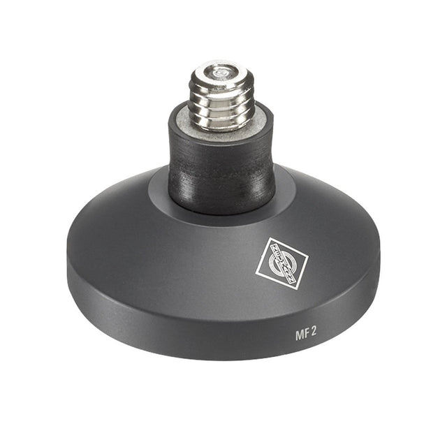 Small table stand with brass base, very sturdy. It has a black matte finish. The bottom is fitted with a non-slip rubber disk. The stand has a 3/8" threaded stud for mounting the SG 21 bk, for example. The rubber shock mount between the stud and the base serves to suppress structure-borne noise.