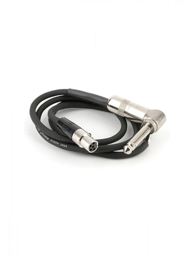 Musical instrument cable, 1/4" right angle phone plug to TA5F. Active matching circuity for matching passive pickups
