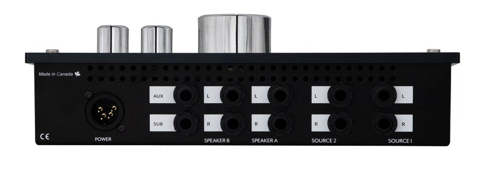 Rear panel: 2 balanced line-level stereo inputs (Source 1 & 2, 1/4" TRS), 2 balanced line-level stereo outputs for speakers (Speaker A & B, 1/4" TRS), Balanced line-level mono subwoofer output (1/4" TRS), Stereo unbalanced Aux output (1/4" TRS)