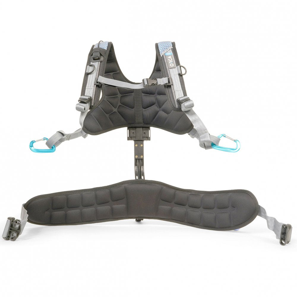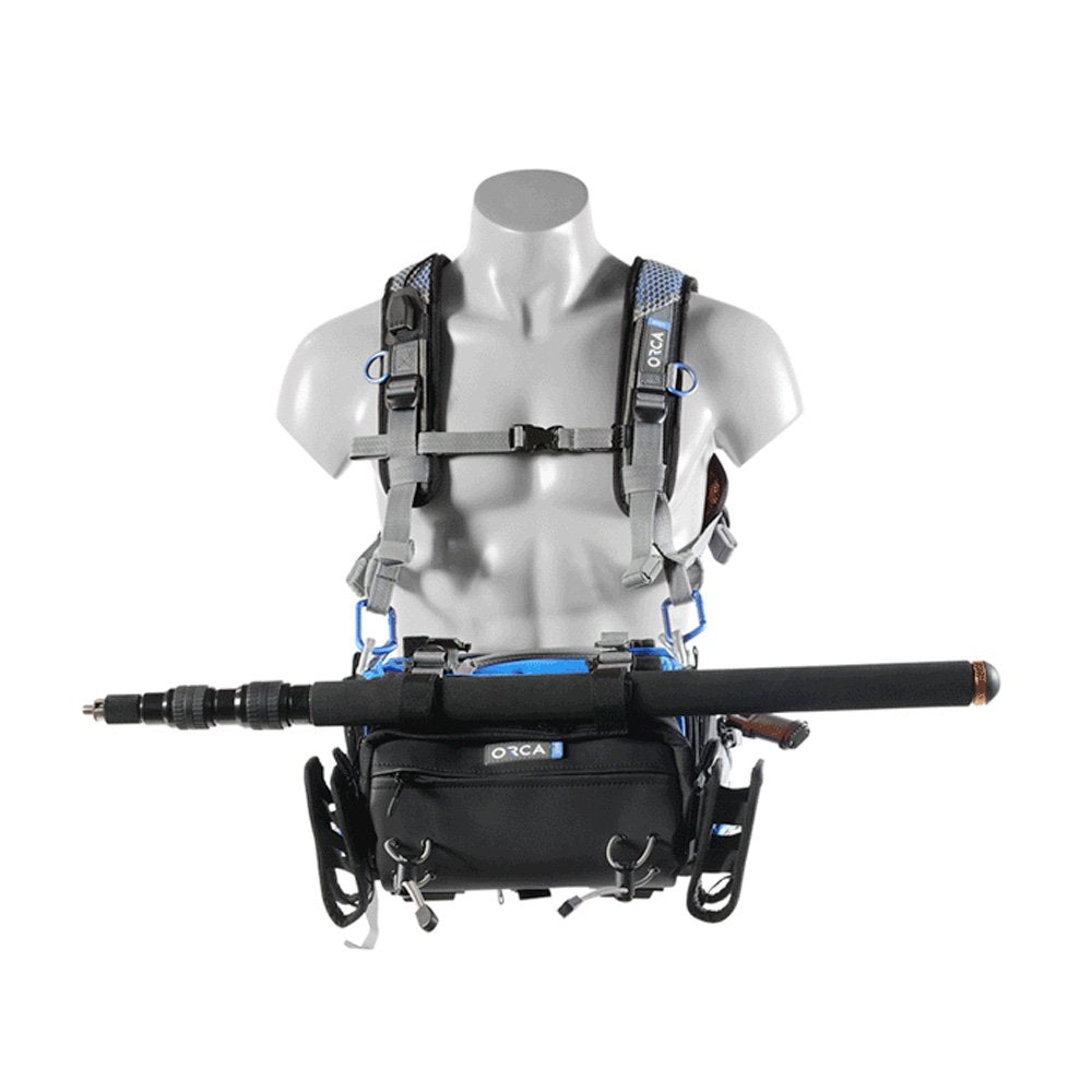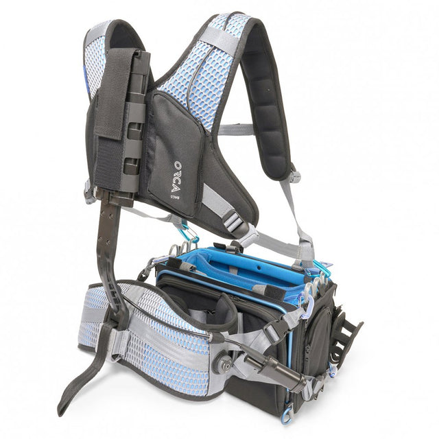 The Orca OR-445 (Spinal Support System) Sound Bag Harness is a patented design intended to protect and support audio operators' backs while they carry heavy equipment. The harness comes in a size that fits most users.