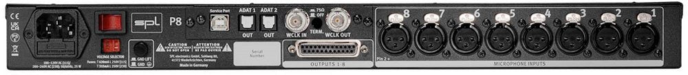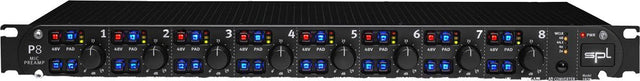 The SPL P8 is a high-end, eight-channel microphone preamplifier designed to offer pristine audio quality for multi-channel recording. Each of the eight preamps is built with discrete technology, ensuring a signal path free from integrated circuits (ICs). This design, utilizing individual transistors, is tailored for audiophiles and professionals who prioritize sound purity, contributing to the unit's open and transparent sonic characteristics. The preamplifiers provide a flexible gain range from +8 dB to +62 dB, making the P8 suitable for a wide range of microphones, including those requiring higher gain.