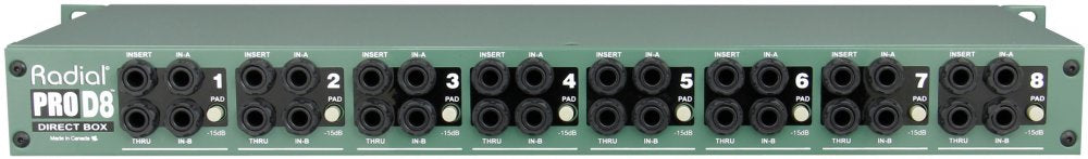 The Radial ProD8 is a high performance 8-channel passive direct box optimized for keyboard rigs in professional touring. The design begins with fully redundant dual ¼" inputs on all channels. These are summed together to enable the system tech to patch in a backup keyboard and have it on standby should a device go down during a show. This also enables up to 16 keyboards or 8 stereo sets to be connected should the need arise. A (shared) ¼" TRS effects insert jack on each channel allows two keyboards to share the same effect while adding greater routing options while ¼" thru-put delivers a direct feed to the artist's playback system.