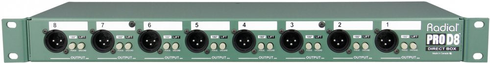 The output panel features isolated XLRs each equipped with ground lift and 180º polarity reverse. Internal switches may be routed to accommodate various schemes such as star grounding. To enhance setup options, the Radial ProD8 is equipped with reversible rack ears. This handy feature allows the system tech to position the inputs on the front of the rack when interfacing with external keyboards or have them inside if the setup is predominantly equipped with rack modules.