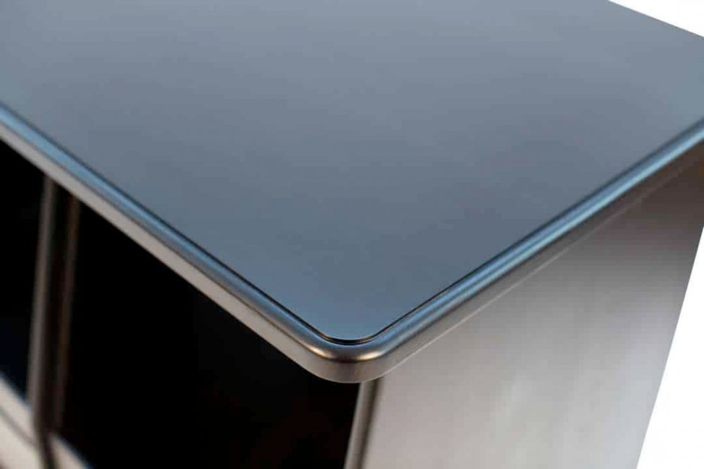 Professional studio rack from high grade birch plywood and solid wood (ash). Available in different versions, from a single rack with 10 rack spaces plus a drawer up to 5 units including an angled version. The solid wood side panels really convey a feeling of lush quality and durability. The lower space of the racks is typically for less used equipment since you have to bend down quite a bit, so we rather used it for a practical drawer.