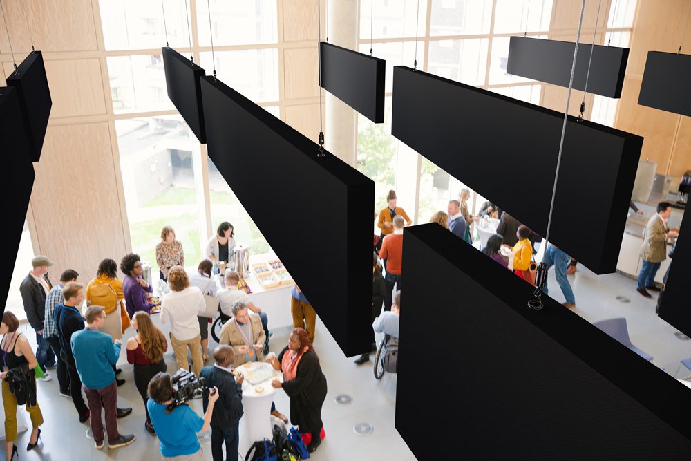 The full sized Saturna is ideal for large spaces with tall ceilings such as gymnasiums, convention centers, warehouses and industrial applications. The reduced height of the Saturna LP makes it suitable for rooms with lower ceilings such as community halls, meeting spaces, house of worship or any other space where ambient noise and intelligibility are of concern. Installing the baffles is easy using the integrated Corkscrew™ anchors and included SlipNot™ suspension cables. The results are immediately noticeable with less room chatter, shorter reverberation time and improved intelligibility. Because the Saturna is twice the density of most acoustic baffles, you will also enjoy greater low frequency absorption and a more natural sounding room.