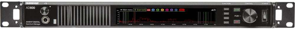 Shure Axient Digital AD600 Digital Spectrum Manager delivers real-time, wide-band spectrum scanning and monitoring from 174 MHz to 2.0 GHz, spectrum analysis, and frequency coordination in a single rack unit. Six antenna connections deliver multiple coverage options while Dante connectivity provides advanced audio monitoring of your network. Use the USB port to export, import, or save backup scans, event logs, and other important data. The AD600 is an essential addition to your Axient Digital professional audio setup.
