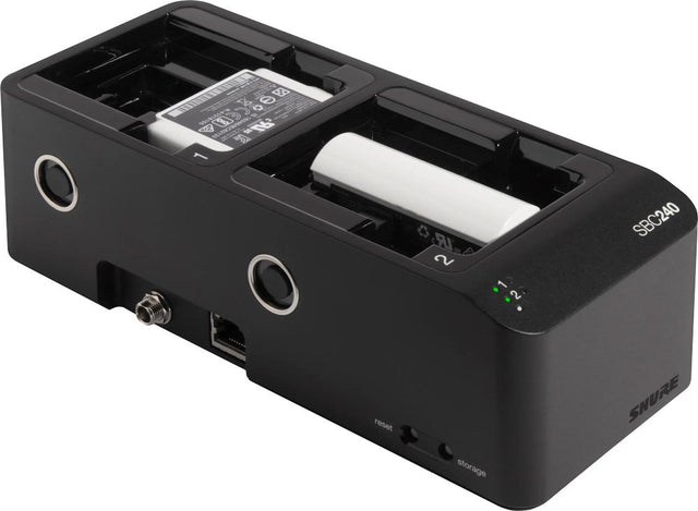 The SBC240 networked docking charger provides a compact charging and storage solution for any combination of 2 SB910/SB920A batteries or ADX1, ADX2, or ADX2FD transmitters using Shure rechargeable batteries. The charger is network-enabled to allow for remote monitoring of charger and battery parameters using Shure Wireless Workbench software. Connect up to 4 SBC240 chargers together to share power and network connectivity.