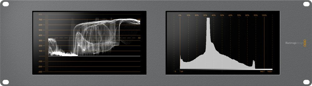Waveform monitor with dual 8 inch displays, waveform, vectorscope, RGB parade, YUV parade, histogram and audio phase with audio level displays