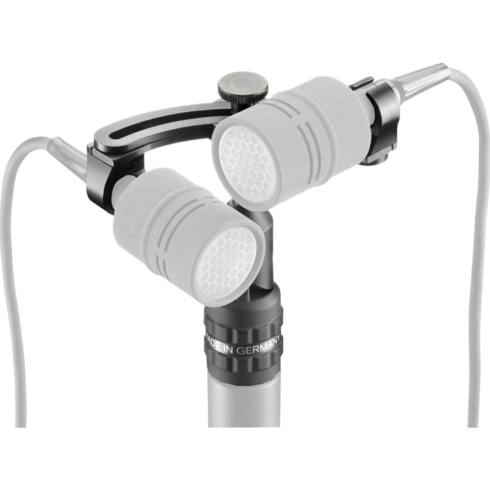 The other pair of holders allows stereo setups according to the "Coincidence Method": Capsules are installed acoustically at one point in space, however, freely adjustable to any angle between 30 and 180.