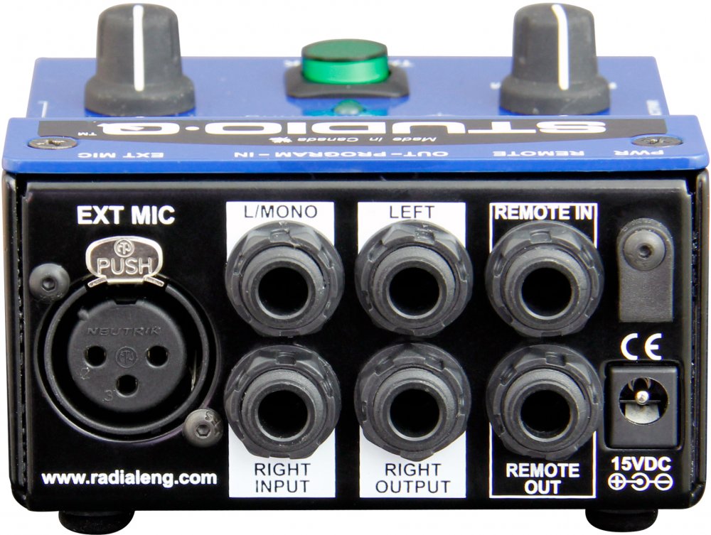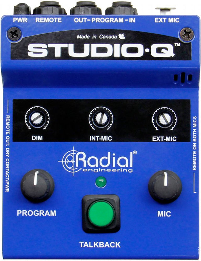 The Studio-Q begins with a simple cue switch that turns on the built-in microphone or the 'producer' mic XLR input. Each mic is equipped withan individualtrim control along with a master mic volume. These can also be remotely activated using a remote JR1 mute footswitch. Once depressed, the signal is routed to the studio headphone system while it automatically shunts the program to the desired level. The program signal path is balanced for easy integration with any console with fully variable level control on the front panel. When the band is full-on, a remote output may be used to send a dry contact to a beacon and attract attention. This can also be set with DC power to accommodate a soon to be released LED beacon.