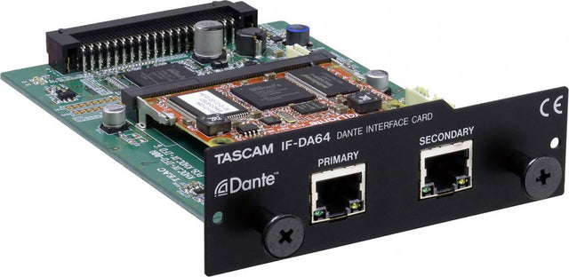 The TASCAM IF-DA64 is an optional 64-channel Dante interface card with ST 2110 support dedicated to the DA-6400 series models. Equipped with primary and secondary ports for I/O redundancy, the IF-DA64 supports simultaneous input/output of 64-channels in sampling frequencies of 44.1k/48kHz, and 32-channels in 88.2k/96kHz.
