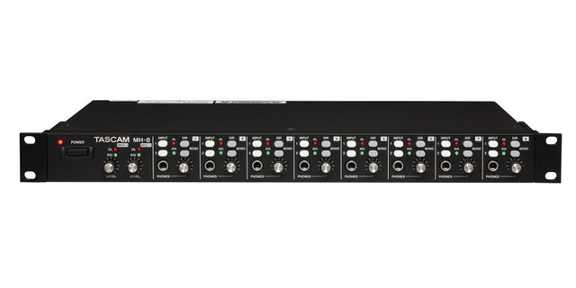 The TASCAM MH-8 is a professional-grade 8-channel headphone amplifier designed to meet the monitoring needs of studios, stages, and installed audio systems. Each of the eight stereo outputs delivers a powerful 250mW per channel at 32 ohm, ensuring clean and loud playback even in high-demand environments. Users can mix and match up to three different input sources-Input 1, Input 2, or a direct channel input-providing unparalleled routing flexibility.