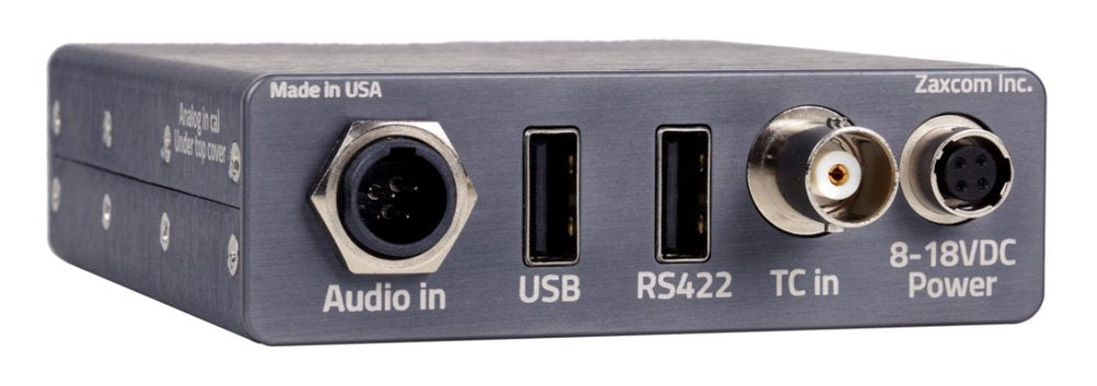 A TA5 audio input offers balanced stereo line level or sample rate converting AES. The BNC connector provides timecode in.