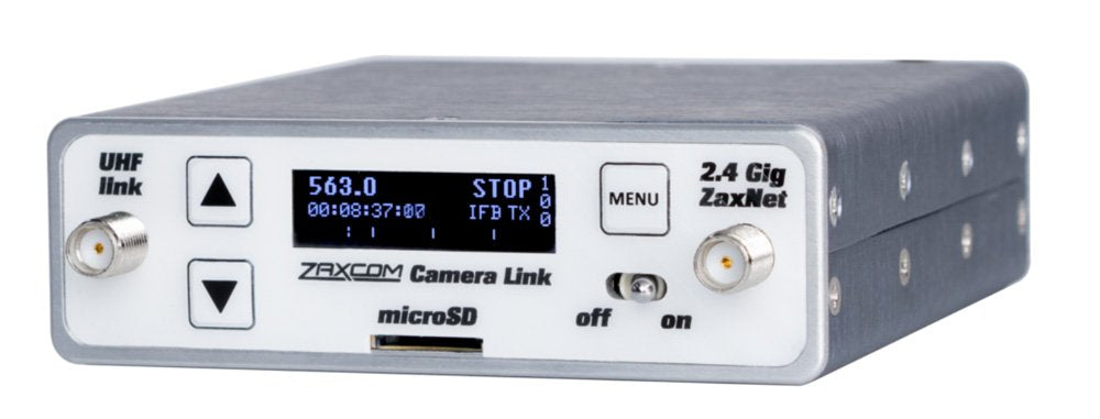 CONNECTIVITY The TRXCL4 sends audio with embedded timecode to camera via a UHF signal to any Zaxcom receiver " QRX200, RX200, QRX235 or MRX/RX-4. It can also send audio and timecode via ZaxNet's 2.4 GHz signal to an ERX3TCD receiver, or remote control commands to any Zaxcom digital recording wireless transmitter.