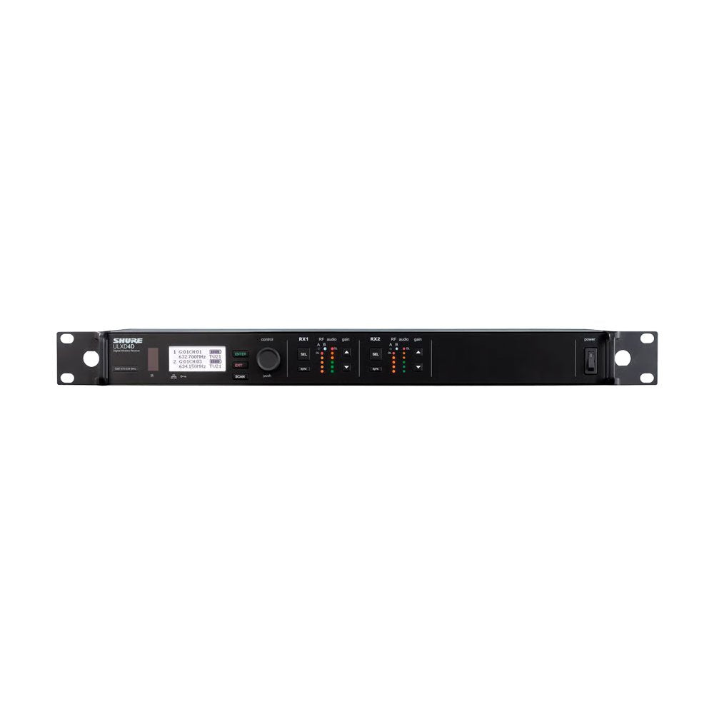 The Shure ULXD4D is a dual-channel digital wireless receiver designed for professional A/V installations and live sound applications. It supports two independent channels within a single rackspace unit and operates in the G57 UHF band (470 to 608 MHz) with an expansive 138 MHz tuning range, accommodating up to 60 simultaneous channels in one band.
