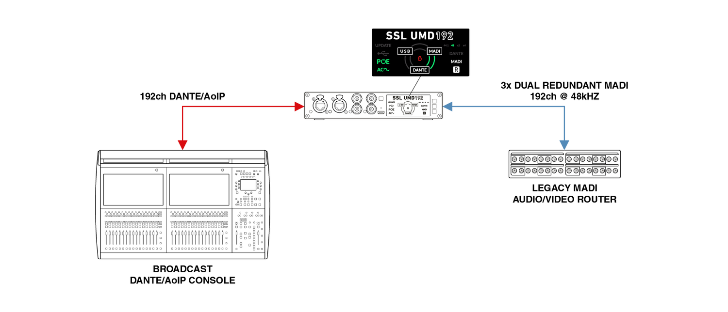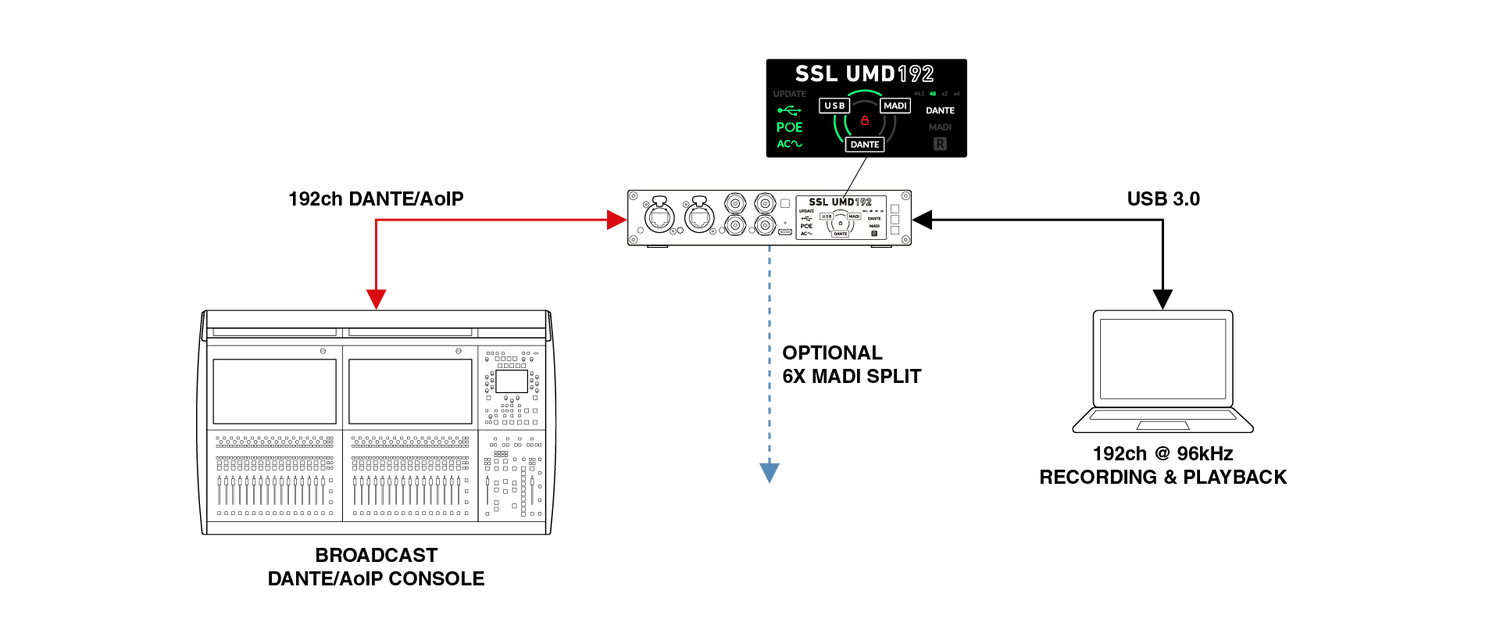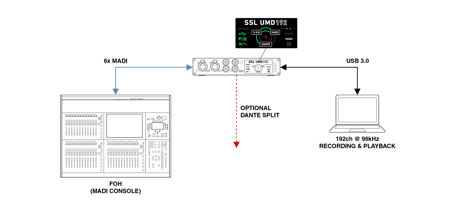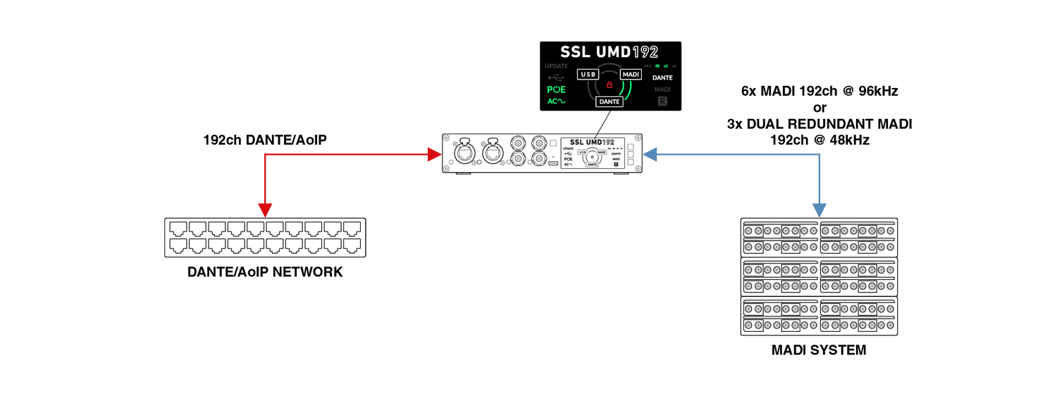 The Solid State Logic UMD192 is a professional-grade USB audio interface designed to deliver high channel counts and dependable performance in live sound, broadcast, studio, and postproduction environments. It supports up to 192 channels at 48 or 96 kHz, and 128 channels at 192 kHz, all within a compact ½ rack unit that’s easy to integrate into mobile or fixed installations. With seamless connectivity across USB, MADI, and Dante, it enables engineers to route audio between formats with minimal latency and full format transparency. This flexibility allows users to consolidate systems, manage large-scale routing requirements, and maintain signal quality across complex setups. Mac users benefit from native Core Audio compatibility without the need for additional drivers, while Windows users can rely on SSL’s dedicated ASIO driver for multi-client workflows. The inclusion of AC, USB, and PoE power options further supports a range of deployment scenarios, including those requiring power redundancy for critical use.