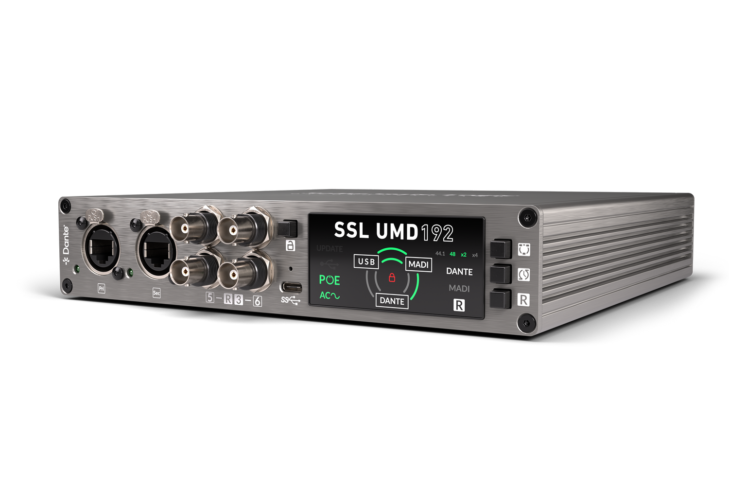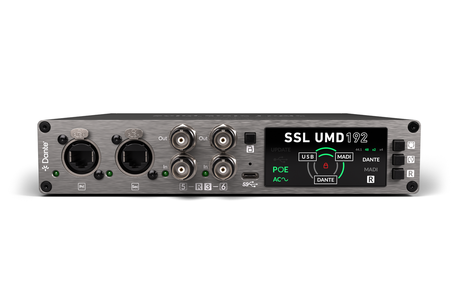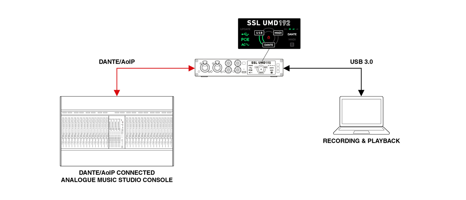 The Solid State Logic UMD192 is a professional-grade USB audio interface designed to deliver high channel counts and dependable performance in live sound, broadcast, studio, and postproduction environments. It supports up to 192 channels at 48 or 96 kHz, and 128 channels at 192 kHz, all within a compact ½ rack unit that’s easy to integrate into mobile or fixed installations. With seamless connectivity across USB, MADI, and Dante, it enables engineers to route audio between formats with minimal latency and full format transparency. This flexibility allows users to consolidate systems, manage large-scale routing requirements, and maintain signal quality across complex setups. Mac users benefit from native Core Audio compatibility without the need for additional drivers, while Windows users can rely on SSL’s dedicated ASIO driver for multi-client workflows. The inclusion of AC, USB, and PoE power options further supports a range of deployment scenarios, including those requiring power redundancy for critical use.