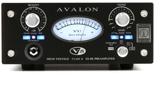 Sonic Excellence The Avalon V5 DI-RE-MIC Preamplifer is an ultra-high performance professional preamplifier, DI and RE-amper. Created for maximum versatility, the V5's sonic signature - "Deep and Controlled Bass, Musical Mid-range and enhanced Vocal Projection" combine with a unique set of user features including, 100% discrete Pure Class A amplification, Avalon's unique "passive" TONE-BANK™, professional VU meter with dual peak LED's, multiple outputs including an instrument level transformer isolated Re-amp. Designed to optimize absolute signal integrity and musical performance, the V5 is ideal for ribbon, dynamic and condenser microphones, bass guitar, acoustic instruments, electric guitars, keyboards, synthesizers, and very low output passive pickups.