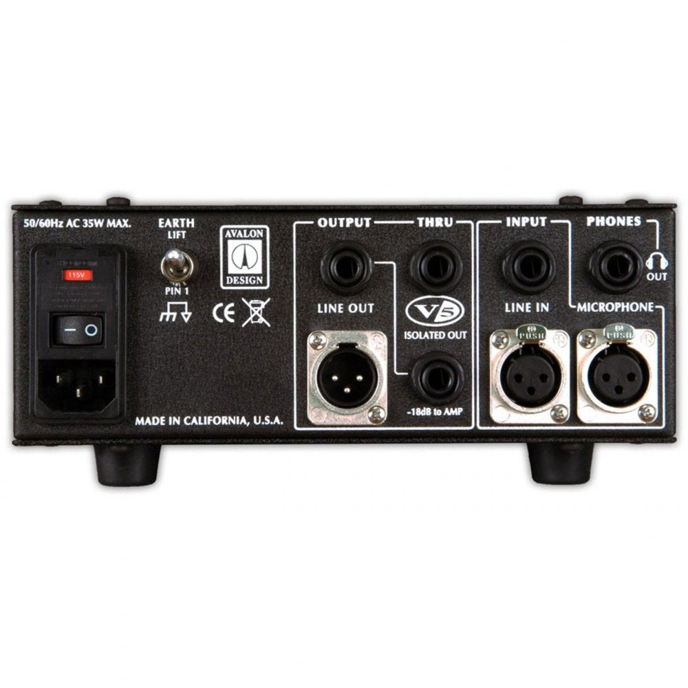 Minimum Signal Path Design The V5 includes a very high quality input transformer (same as the Avalon VT-737sp) with dual microphone input impedance loading for perfect mic/cable matching, high-cut switch for eliminating unwanted acoustic pickup and high frequency noise, headphone monitor amp and DC coupled, 100% Class A output amplifiers for defined bass control. A buffered "thru" output for zero-instrument-load tuners or power amp inputs, internal toroid power transformer with discrete high-voltage power supplies for low noise and sealed silver relays for transparent signal routing.