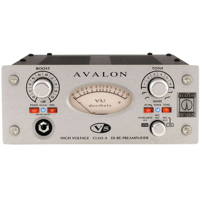 Sonic Excellence The Avalon V5 DI-RE-MIC Preamplifer is an ultra-high performance professional preamplifier, DI and RE-amper. Created for maximum versatility, the V5's sonic signature - "Deep and Controlled Bass, Musical Mid-range and enhanced Vocal Projection" combine with a unique set of user features including, 100% discrete Pure Class A amplification, Avalon's unique "passive" TONE-BANK™, professional VU meter with dual peak LED's, multiple outputs including an instrument level transformer isolated Re-amp. Designed to optimize absolute signal integrity and musical performance, the V5 is ideal for ribbon, dynamic and condenser microphones, bass guitar, acoustic instruments, electric guitars, keyboards, synthesizers, and very low output passive pickups.