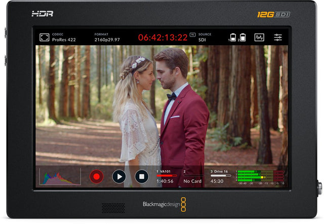 Blackmagic Video Assist 7" 12G HDR adds professional monitoring and recording to any SDI or HDMI camera in all HD, Ultra HD, 2K and 4K DCI formats! The super bright 2500nit 7 inch HDR monitor supports 3D LUTs and features professional scopes along with powerful focus assist and exposure tools that help you accurately set focus, exposure and frame shots. Dual built in SD card recorders save files from any camera in 10-bit 4:2:2 ProRes or DNx formats. You also get two mini XLR connections with 48V of phantom power and a noise floor of -128dBV for high quality, crystal clear audio recording. Plus, you can start editing immediately because you don't have to convert the files!
