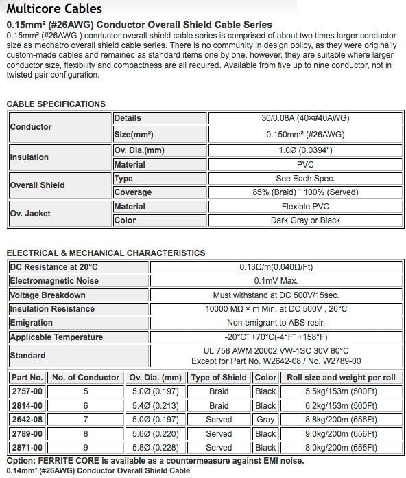 0.15mm² (#26AWG ) conductor overall shield cable series is comprised of about two times larger conductor size as mechatro overall shield cable series. There is no community in design policy, as they were originally custom-made cables and remained as standard items one by one, however, they are suitable where larger conductor size, flexibility and compactness are all required. Available from five up to nine conductor, not in twisted pair configuration.
